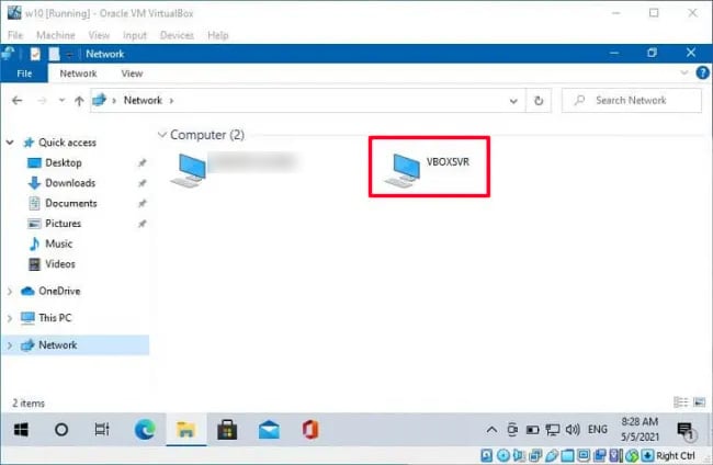 Abra a máquina virtual do Windows dentro do VirtualBox. Abra o Explorador de Arquivos. Vá para Rede clicando no painel de navegação. Clique duas vezes no Virtual Box Server (geralmente com o nome VBOXSVR) para encontrar a pasta compartilhada.