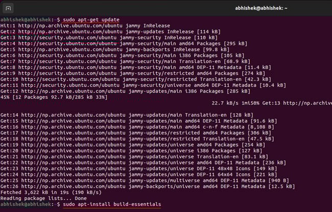 Abra o Terminal Linux. Primeiro, você precisa instalar o build-essentials no sistema. Para fazer isso, execute os seguintes comandos: sudo apt-get update sudo apt-install build-essentials sudo reboot