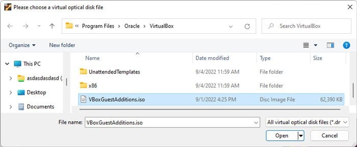 Depois de reiniciar, vá para Dispositivos > Discos ópticos > Escolha um arquivo de disco no menu. No Windows, vá para C:\Program Files\Oracle\VirtualBox e selecione VBoxGuestAdditions.iso. Em seguida, clique em Abrir. No Mac, o arquivo está dentro do Contents/macOS e no Linux, geralmente no diretório/opt/VirtualBox/.