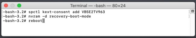 Alguns sistemas Mac podem precisar de um comando diferente. Verifique com fontes oficiais se o acima não funcionar. No modo Recovery, execute o Terminal e digite os comandos abaixo: