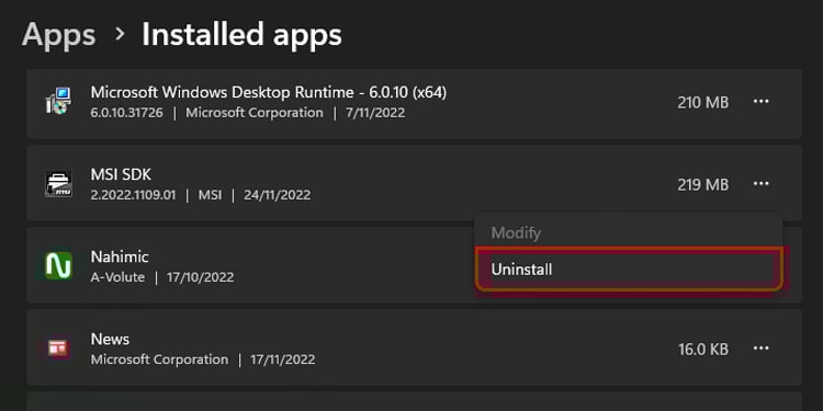 Clique o botão Desinstalar no prompt. Execute as mesmas etapas para MSI SDK na lista de aplicativos.