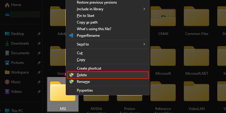 Agora, pressione Windows + E para abrir o Windows Explorer. Vá para C:\Program Files (x86) Clique com o botão direito do mouse na pasta MSI e escolha o ícone Excluir .