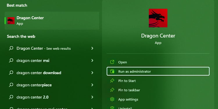 Pressione a Tecla Windows para abrir a Pesquisa do Windows. Digite Dragon Center e clique com o botão direito do mouse no aplicativo listado.