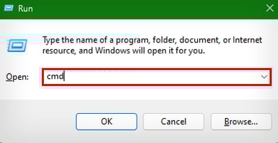 Pressione Windows + R para abrir Executar. Digite cmd e pressione Ctrl + Shift + Enter para abrir o Prompt de Comando no modo administrador.