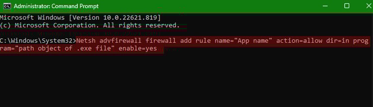 Netsh advfirewall firewall add rule name=”App name”action=allow dir=in program=”path object of.exe file”enable=yes
