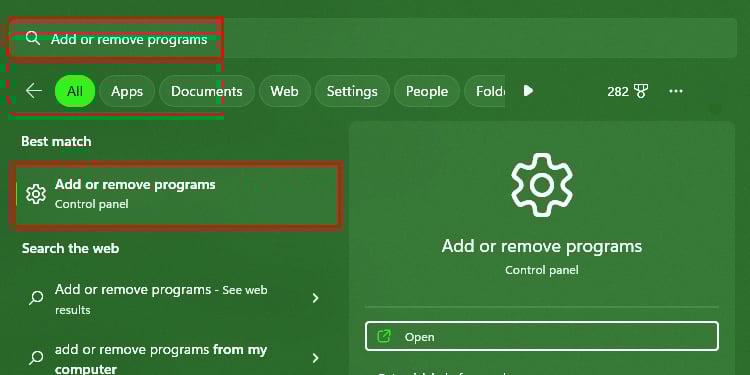 Pressione a tecla do Windows para abrir a Pesquisa do Windows. Digite Adicionar ou remover programas e pressione Enter.