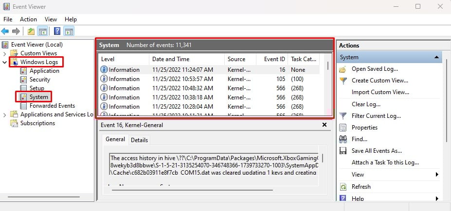 No painel esquerdo, navegue até Logs do Windows > Sistema. Na parte central da janela Visualizador de eventos, você pode ver todos os eventos ocorridos no sistema operacional.