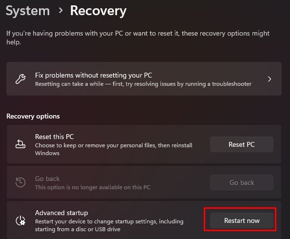 pressione a tecla Windows + I para abrir Configurações. Vá para Sistema > Recuperação. Em Inicialização avançada, selecione Reiniciar agora.