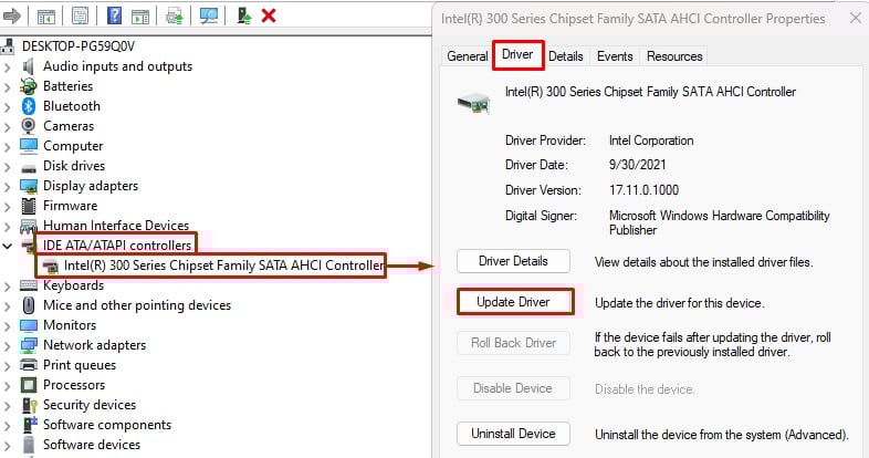 Pressione o botão Windows + Tecla X para abrir o Gerenciador de Dispositivos. Expanda Controladores IDE ATA/ATAPI. Clique duas vezes no dispositivo listado dentro. Vá para a guia Driver e selecione Atualizar driver.