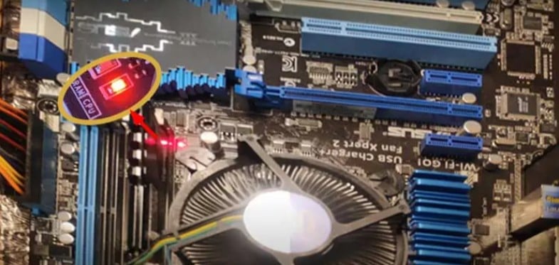 Agora ligue o PC e deixe-o descansar por alguns minutos. Verifique se a placa-mãe tem algum LED aceso. Uma luz LED em uma placa-mãe geralmente significa que o sistema está tendo problemas para detectar uma peça de hardware.