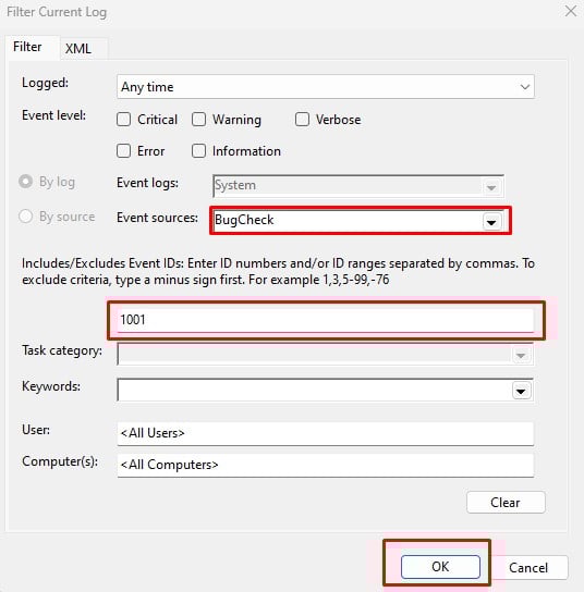 Defina as origens do evento como BugCheck ou insira a ID do evento como 1001. Clique em OK para exibir todos os erros de tela azul.