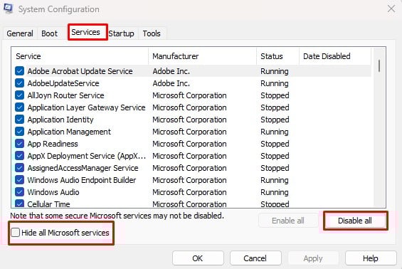 Para garantir que esse não seja o caso, tente executar uma inicialização limpa. Quando um sistema limpo é inicializado, ele interrompe todos os serviços que não são da Microsoft. Para executar a inicialização limpa,