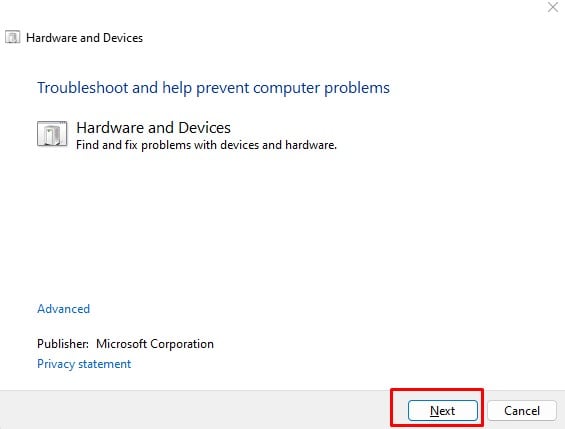 Clique em Avançar para iniciar o processo de solução de problemas de hardware.