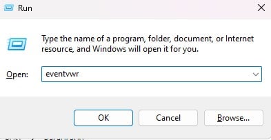 Pressione a tecla Windows + R para abrir Executar. Digite eventvwr e pressione Enter para abra o Visualizador de eventos.