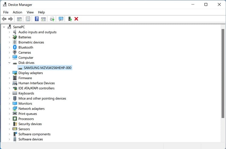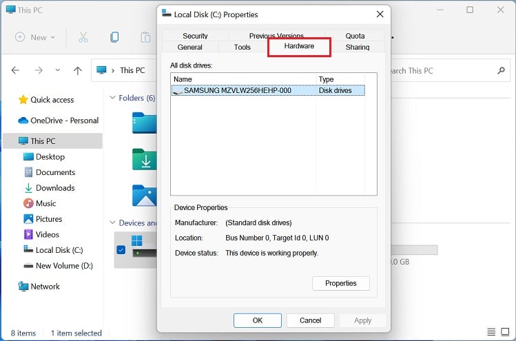 A última maneira de descobrir o tipo de dispositivo de armazenamento do seu laptop é verificando a marca e o modelo. Se você não tiver certeza sobre isso, veja como inspecioná-lo usando as propriedades do disco: