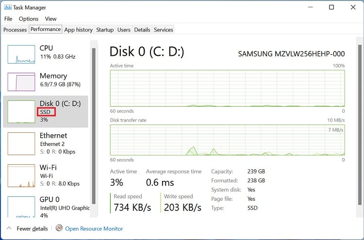 Como alternativa, você pode usar Ctrl + Shift + Esc tecla de atalho para abrir o utilitário. Agora, vá para a guia Desempenho e selecione Disco. Você pode ver claramente o HDD ou SSD em seu laptop no painel esquerdo.