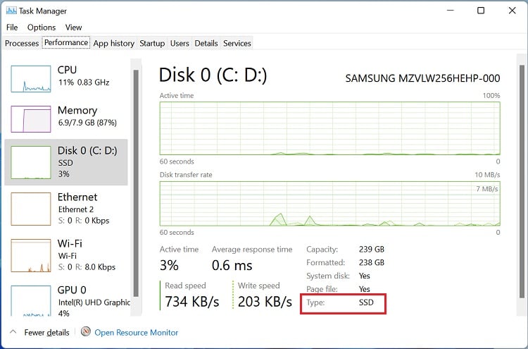 A maneira mais simples e eficaz de verificar seu o tipo de unidade de disco do laptop é do Gerenciador de Tarefas. Este é um utilitário embutido do Windows onde você pode visualizar todos os recursos do sistema disponíveis, incluindo modelo de disco, tempo ativo, taxa de transferência, capacidade, etc.