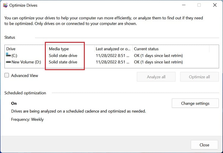 Primeiro, pressione Windows + R para abrir a caixa de diálogo Executar. Em seguida, execute o comando dfrgui.exe para abrir a janela Optimize Drives. Na seção de status, verifique o campo Tipo de mídia. Aqui, o tipo de unidade será claramente mencionado como”Unidade de disco rígido”ou”Unidade de estado sólido”.