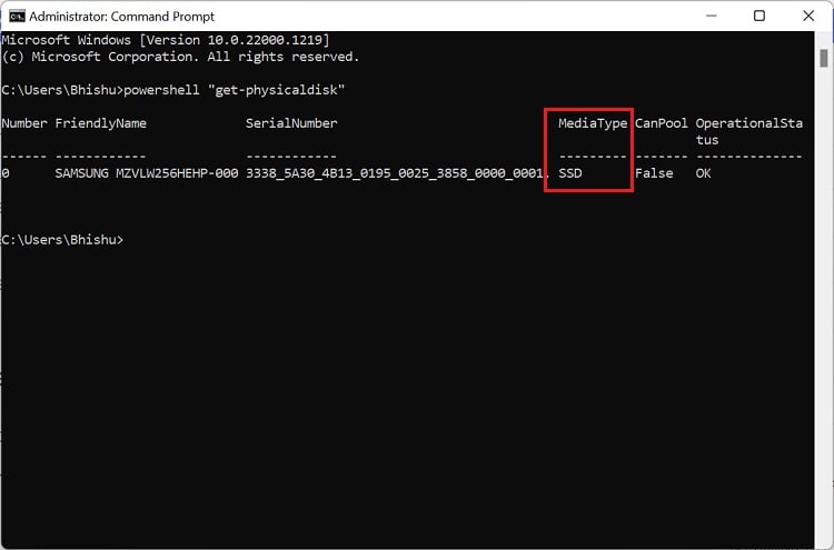 powershell”get-physicaldisk”Finalmente, verifique o campo MediaType para identificar se seu laptop usa HDD ou SSD.