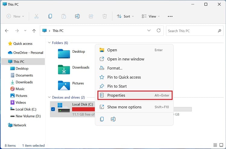 Primeiro, mostre sua área de trabalho e clique duas vezes em Este PC. Isso o levará ao Explorador de Arquivos. Em Dispositivos e Drivers, você notará um ou mais discos ou volumes locais. Clique com o botão direito em qualquer uma das partições de HDD ou SSD e selecione Propriedades.