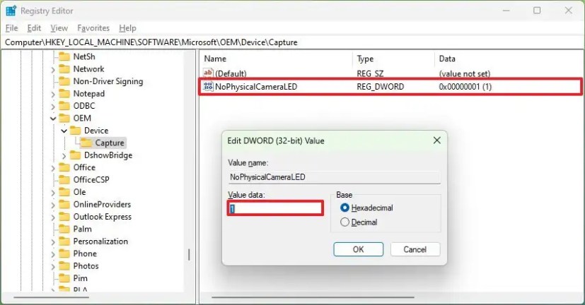 Se quiser desfazer as alterações, você pode usar as mesmas etapas descritas acima, mas na etapa 4, altere o valor do NoPhysicalCameraLED ke y de 1 a 0.