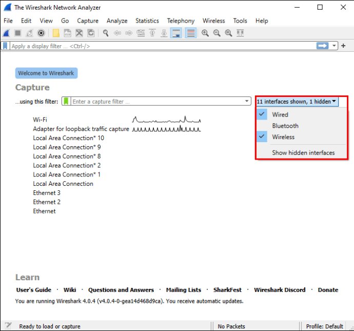 選擇要從中捕獲數據包的網絡接口。這可能是您計算機上的 Wi-Fi 連接、以太網連接或任何其他網絡連接。