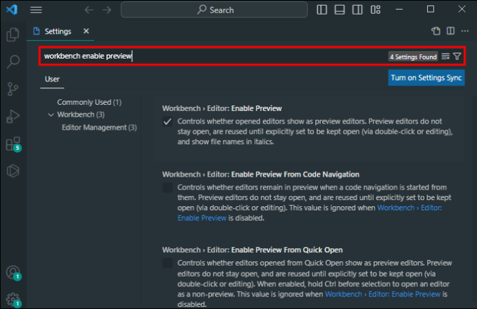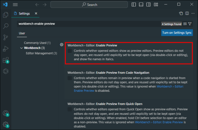 VS Code 的優點在於,您可以隨時返回並撤消更改。因此,如果您不再希望在其中顯示文件,則只需執行相同的步驟只需選中“啟用預覽”功能即可開始。
