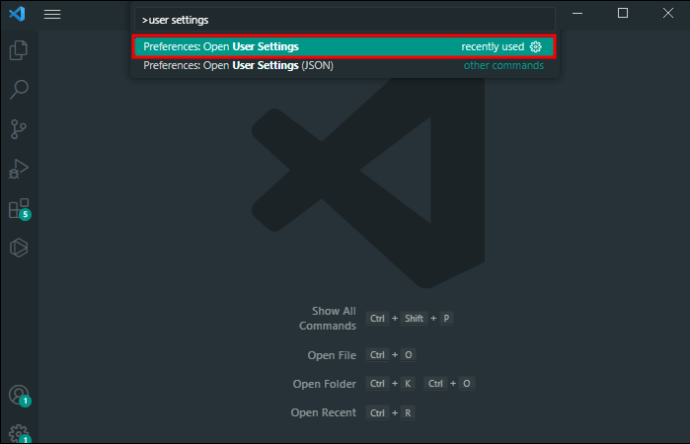 選擇“首選項”並點擊提示,打開用戶設置。您還可以通過點擊“Ctrl + ,”或“CMD + ,”來訪問您的設置,具體取決於您的平台。