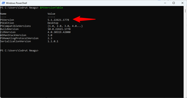 提示: 正如您在上一個屏幕截圖中可能已經註意到的,您可以檢查您使用的 PowerShell 版本您的 PC 上運行以下命令: