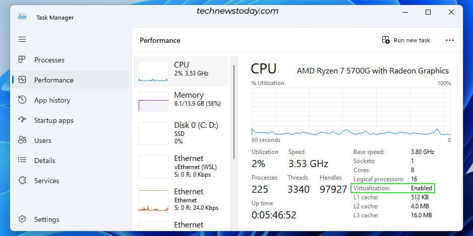 退出 BIOS 後,系統應重新啟動進入 Windows。您可以從任務管理器輕鬆檢查虛擬化狀態。