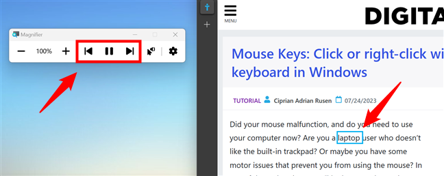 如果您願意,您還可以指示放大鏡從您單擊鼠標的位置開始閱讀。為此,請按放大鏡應用程序中的“從此處閱讀”按鈕(它看起來像一個光標,旁邊有一個揚聲器),然後單擊或點擊您想要它朗讀給您聽的文本。或者,您可以使用Ctrl + Alt + 鼠標左鍵單擊快捷鍵可從特定位置開始閱讀。