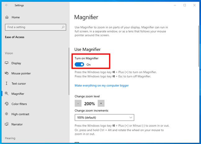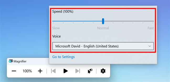 這就是有關如何使用放大鏡在 Windows 中閱讀文本的全部信息。要更改此應用程序可用的所有設置,請單擊或點擊“語音”下的“轉到設置”鏈接,或按照本指南第一章中顯示的步驟操作(設置> 輔助功能> 放大鏡)。然後,閱讀下一節以了解看看您可以對放大鏡的工作方式進行哪些更改: