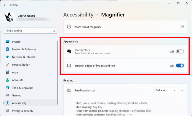 反轉顏色:如果您需要更好的對比度,可以打開此開關,放大區域的顏色會反轉。請注意,如果您在鍵盤上按 Ctrl + Alt + I,也可以在使用放大鏡時直接啟用該開關。圖像和文本的平滑邊緣:此選項默認打開,您應該保留它,因為它使放大的區域看起來更好。但是,如果屏幕上的內容看起來不太好,您可能需要嘗試關閉此開關。