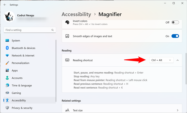 關於放大鏡在Windows 中的工作方式,您最後可以調整的是閱讀鍵盤快捷鍵。在“設置”的“輔助功能”部分的“放大鏡”頁面上,滾動直至到達閱讀區域。在那裡,您會找到一個設置:閱讀快捷方式。右側有一個下拉列表,其中有四個選項:Ctrl + Alt(默認選項)、Caps Lock、Insert 以及 Caps Lock 或 Insert。