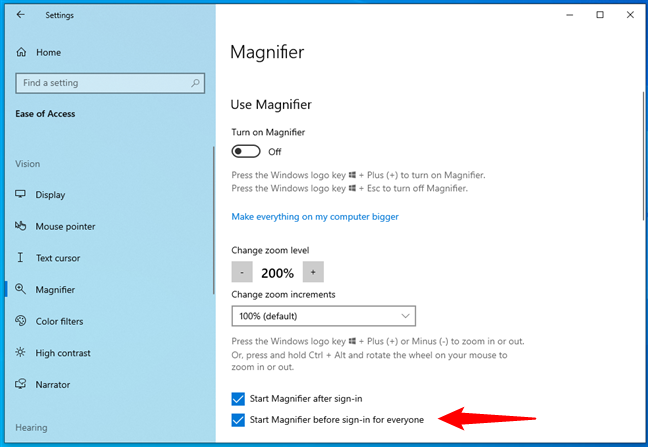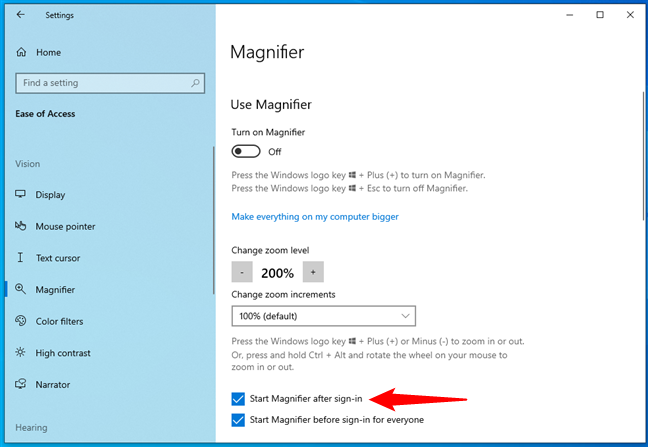 為此,如果您希望啟動應用程序,請在 Windows 10 設置應用程序的放大鏡頁面上選中“登錄後啟動放大鏡”框使用您的用戶帳戶登錄後。