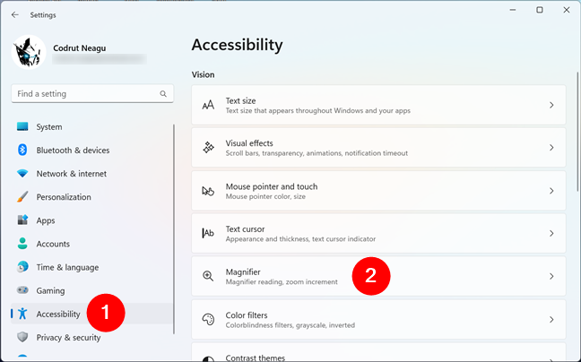 Windows 11 的“設置”應用還允許您打開放大鏡。啟動它(Windows + I),選擇左側邊欄上的輔助功能,然後單擊或點按右側窗格中的放大鏡。