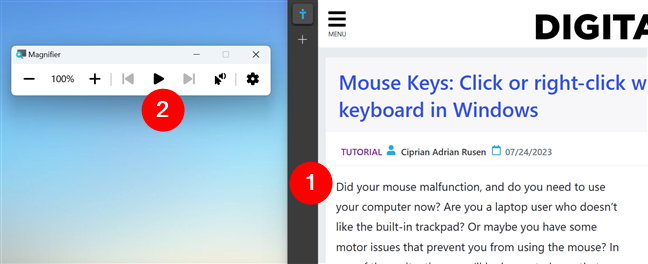 在Windows 11 和Windows 10 中的放大鏡應用程序還包括用於朗讀文本的選項。要開始閱讀,請單擊或點擊您想听的文本開始的位置。然後,單擊或點擊放大鏡應用中的“播放”按鈕,或者按鍵盤上的Ctrl + Alt + Enter,放大鏡將立即開始閱讀該文本。