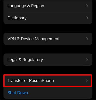 向下滾動到底部並點擊轉移或重置 iPhone。