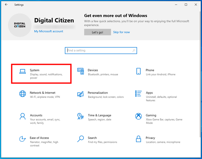 在 Windows 10 中更改屏幕分辨率或方向是通過顯示設置完成的。為此,請打開“設置”應用(Windows + I),然後單擊或點擊“系統”。