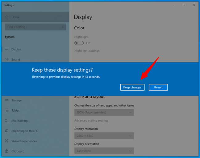 選擇所需的分辨率後,Windows 10 會立即應用它,但是它還會顯示一個彈出窗口,其中顯示消息“保留這些顯示設置?”。它會倒計時到零,然後自動將您的顯示器恢復到更改之前的分辨率。這是一種保護措施:如果您的屏幕變黑或者顯示的圖像看起來不可用,您所要做的就是等待幾秒鐘,然後您就會恢復原來的顯示。另一方面,如果一切順利並且您對外觀感到滿意,請單擊或點擊“保留更改”以使用新的屏幕分辨率。
