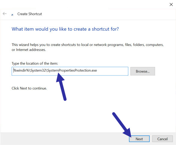 在“創建快捷方式”嚮導中,將以下路徑粘貼到位置字段中,然後單擊“下一步“。