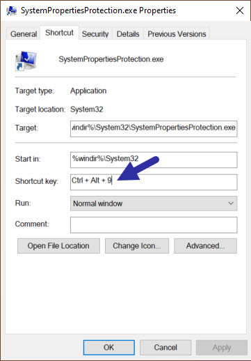 要更快地打開系統還原工具,請將鍵盤快捷方式分配給新創建的桌面快捷方式。操作方法如下: