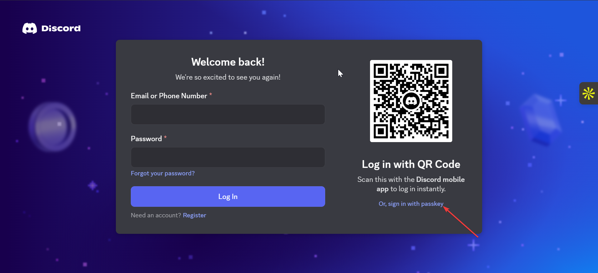 瀏覽器登錄:轉至 Web 登錄,輸入電子郵件/電話和密碼,然後單擊 登錄。 二維碼登錄:打開 Discord 應用,掃描計算機上的二維碼,然後批准登錄。 備用代碼:如果您使用 2FA 並且無法訪問身份驗證器,請輸入保存的備用代碼。