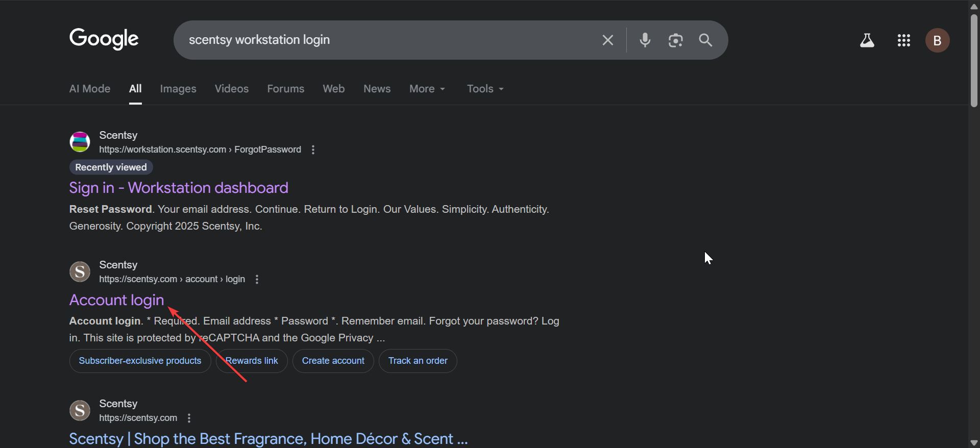 在電腦或手機上打開瀏覽器並蒐索scentsy工作站登錄。選擇正確的鏈接(仔細檢查域名)以導航至工作站登錄頁面。