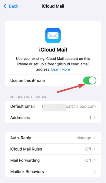 在 iOS 設備上打開“郵件”應用。確保您的 iCloud 帳戶已登錄,方法是轉至“設置”>“[您的姓名]”>“iCloud”,點擊“郵件”選項,然後切換“在此 iPhone 上使用”。您現在可以直接從“郵件”應用訪問您的 iCloud 收件箱。