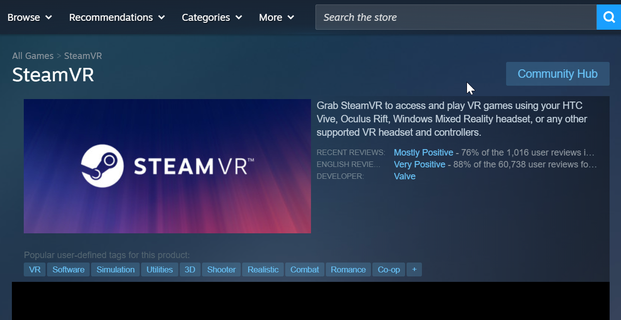 在 Steam 內,在商店搜索欄中輸入 SteamVR。打開結果並單擊“安裝”。選擇您的安裝驅動器並讓 Steam 下載軟件包-大約 6 GB,具體大小取決於版本。