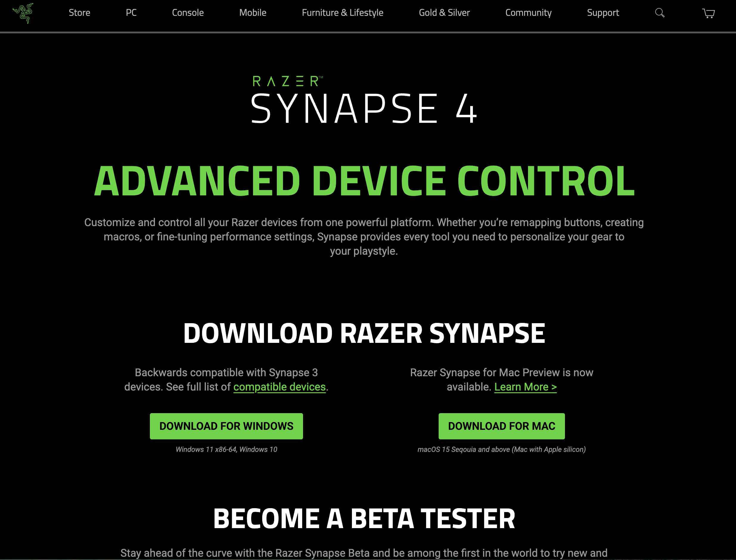 安裝或升級 Razer Synapse 可確保您的 Razer 設備發揮最佳性能。按照適用於您的系統(Windows 或 macOS)的正確流程來解鎖新功能、提高速度和更智能的自定義工具。借助 Synapse 4,您的遊戲設置比以往更快、連接性更強且更易於控制。