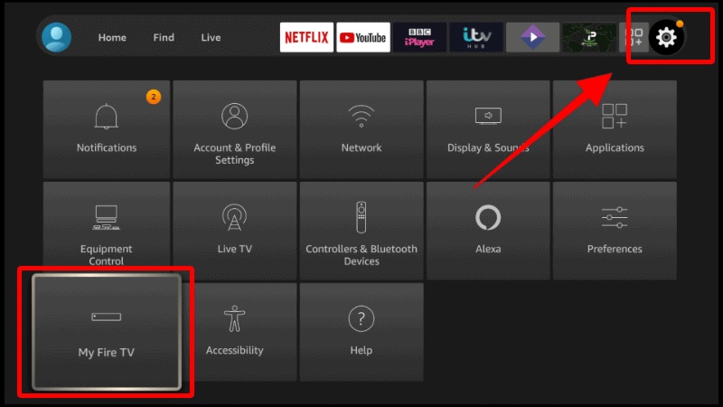 從 Fire TV 主屏幕中,選擇設置。 打開我的 Fire TV > 開發者選項。 打開ADB 調試(可選)並將來自未知來源的應用設置為打開。 出現提示時,請確認您了解風險。