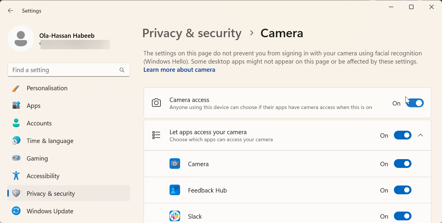 現代系統默認阻止攝像頭訪問,直到您批准為止。在 Windows 上,打開“設置”>“隱私和安全”>“相機”,然後切換相機或 Teams 等應用程序的訪問權限。在 macOS 上,轉到“系統設置”>“隱私和安全”>“攝像頭”,然後啟用對您首選應用的訪問權限。