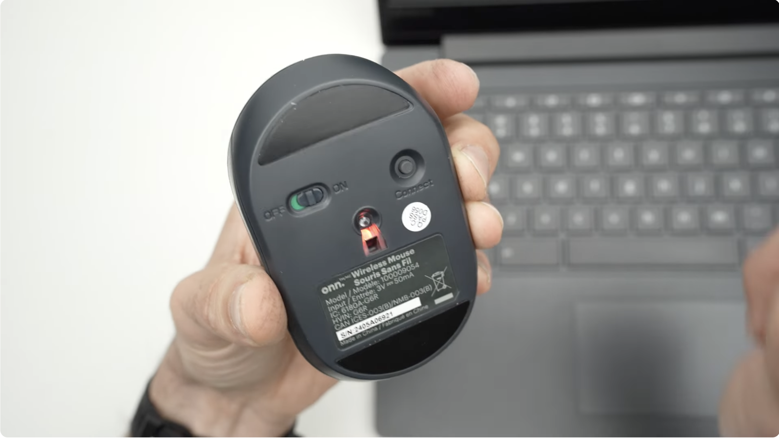 在鼠標底部,按住連接按鈕,直到 LED 燈開始閃爍。這表明設備處於配對模式。對於藍牙型號,請在計算機上啟用藍牙,然後從可用設備列表中選擇 Onn 鼠標或 BT5.1 鼠標。